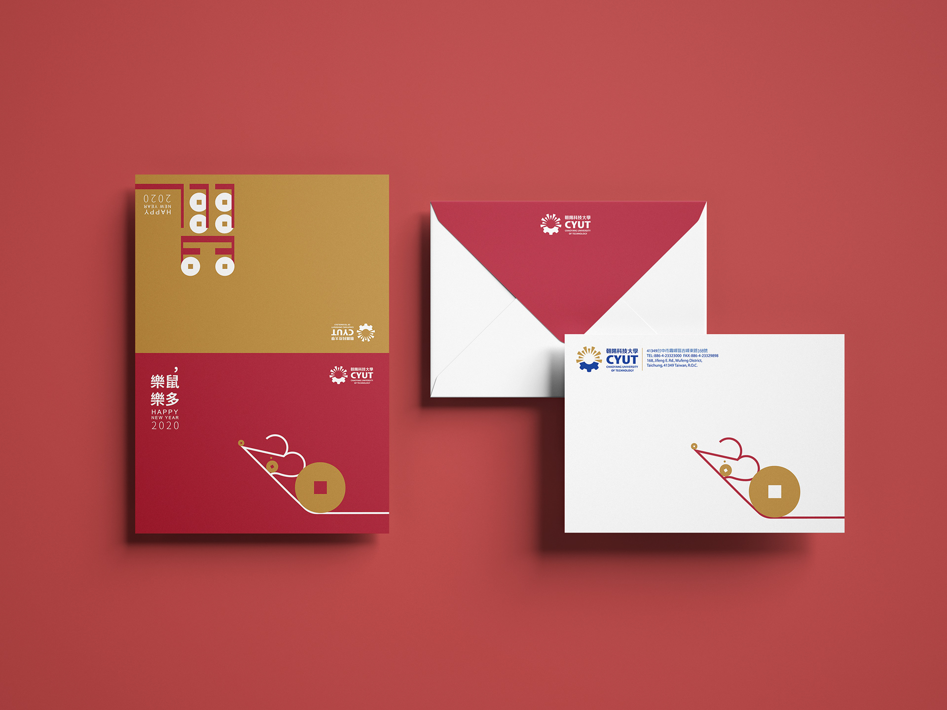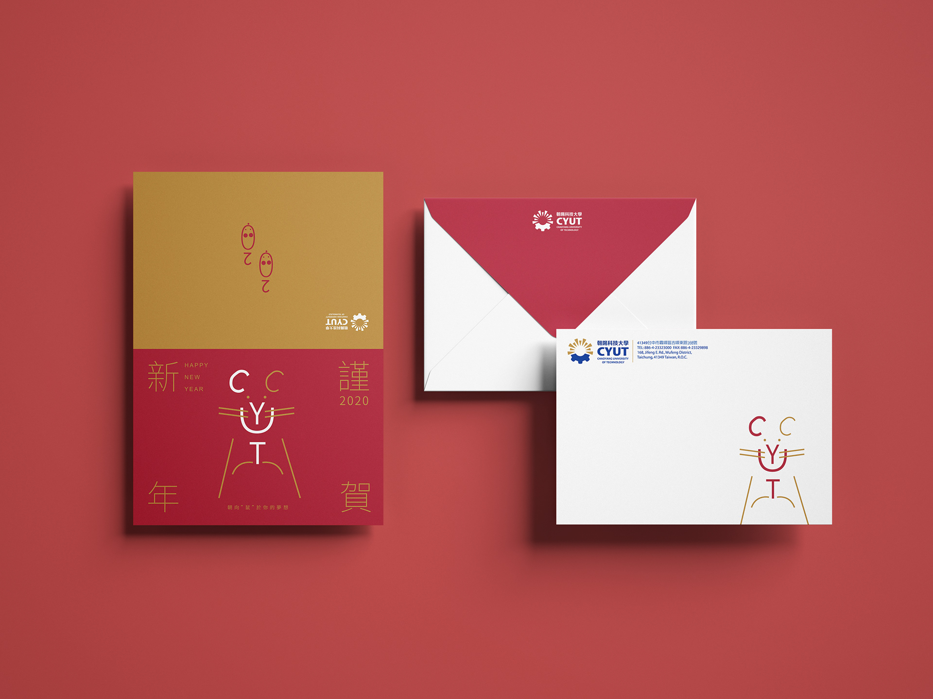 賀卡設計分成兩款讓業主選擇,分別是以朝陽科技大學CYUT的縮寫,組合成老鼠鞠躬的意象。