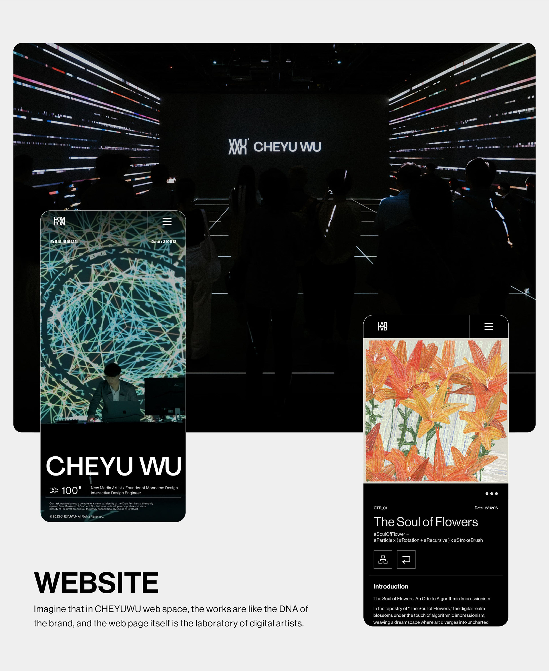 The CHEYUWU website design presents each artwork as the DNA of the brand, reflecting its unique creative identity. The web space itself functions as a digital art laboratory, where online experience, branding, and interactive creativity merge to showcase the vision of digital artists.